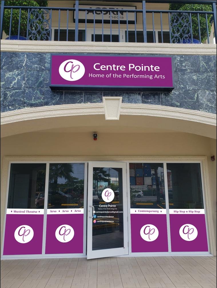 Full storefront signage + window wraps for a performing arts academy — Musical Theatre, Acro, Contemporary & Hip Hop.